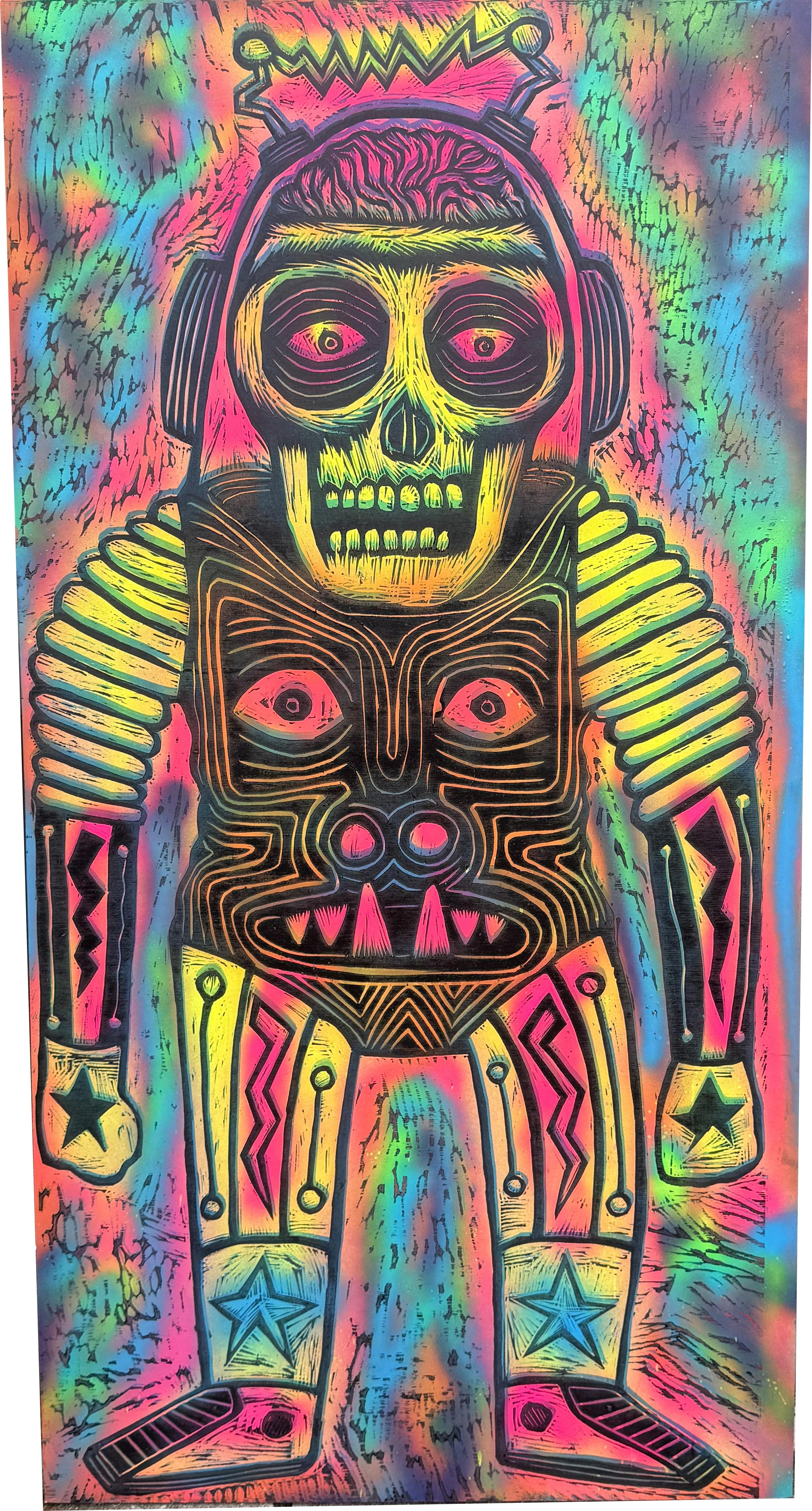 Woodcut on Spray Painted Wooden Panel